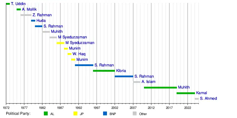 Salehuddin Ahmed (economist)Mustafa Kamal (politician)Abul Maal Abdul MuhithA. B. Mirza Azizul IslamSaifur Rahman (Bangladeshi politician)Shah A M S KibriaSaifur Rahman (Bangladeshi politician)Mohammad Abdul MunimWahidul HaqMohammad Abdul MunimM SyeduzzamanM SyeduzzamanAbul Maal Abdul MuhithSaifur Rahman (Bangladeshi politician)Mirza Nurul HudaZiaur RahmanTajuddin Ahmed