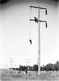 The first transmission line constructed by the government was associated with the Okere Falls Power Station near Rotorua. Electricity was transmitted at 3.3 kV over a 13-mile (21 km) route to Rotorua, and was used to drive sewage pumps, and some public buildings including five thermal baths.[6]