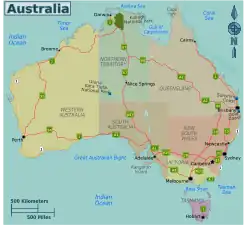 In addition to the network of federally funded National Highways defined in 1974, there was also a system of "national routes". This scheme, which predated the National Highways in 1953, was a plan to coordinate State road authorities to allocate consistent highway numbers to major highways which traversed more than one State, for the convenience of travellers.[20] The most notable example is "Highway 1", which follows the periphery of the continent, and only parts of which form part of the former National Highway and current National Land Transport (Roads) Network.