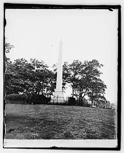The first monument was never completed, its stones crumbled and fell, and around them, for four years, surged the American Civil War. From time to time, attempts were made to complete the monument or to build a new one. Two or three times, bills for that purpose passed the U.S. Senate and failed to pass the United States House of Representatives.[3]