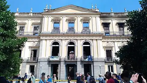 A large fire broke out shortly after the museum closed on 2 September 2018, reaching all three floors of the building.[20][21][22] Firefighters were called at 19:30 local time (22:30 UTC)[23] and arrived quickly at the scene.[19] However, the fire chief reported that the two fire hydrants closest to the museum had no water, and trucks had to be sent to a nearby lake.[24] According to the spokesman for the fire department, the fire crews went inside the burning building to rescue artifacts, despite there being no people inside, and they were able to remove items with the help of museum staff.[25][26]