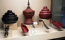 • In the Hall of Culture exhibits on Burmese rural life are displayed, covering social, economic and cultural traditions and modes of transport. Examples include a traditional Burmese bullock cart, still in use in many parts of the country, an offering bowl for monks, gilded and wrought with mosaics of semi-precious stones, and personal ornaments and jewelry worn by Burmese people since ancient times.
