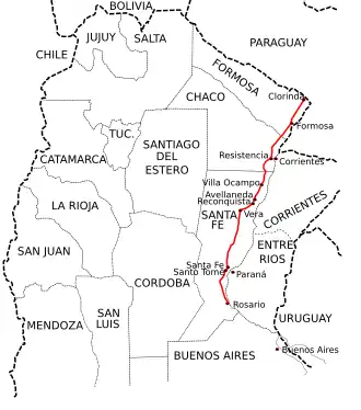 National Route 11 (RN11), known officially as Carretera Juan de Garay, is a road in Argentina, which runs through the provinces of Santa Fe, Chaco, and Formosa. From its beginning in the Rosario Beltway until it ends at the San Ignacio de Loyola International Bridge, on the border with Paraguay, it covers 980 km (610 mi), fully paved. In Formosa Province, the 80 km (50 mi) highway is under construction between the intersection with National Route 81 to the north of the City of Formosa and the town of General Lucio V. Mansilla on the shores of the Bermejo River bordering the Chaco Province.