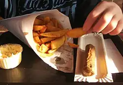 - ^ "Fish and Chips" in Fast Food and Junk Food: An Encyclopedia of What We Love to Eat (2011). Ed. Andrew F. Smith. ABC-CLIO p. 258 .