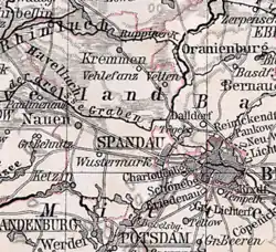 The Nauen Plateau (German: Nauener Platte) is a low plateau in the German states of Brandenburg and Berlin. It rises above the surrounding countryside by an average of 15 metres (49 ft) and is a largely contiguous upland area that was formed during the Saale and Weichselian glaciations. It consists predominantly of ground moraine deposits, partly overlain by gently rolling end moraine formations. Whilst the neighbouring regions of Zauche to the south, the Teltow to the southeast and the Barnim to the northeast have the same name as their geological formation, the cultural landscape on the Nauen Plateau bears the historical and regional name of Havelland. That said, the river country of the Havelland extends beyond the plateau to include the Havel valley and other lowland areas.