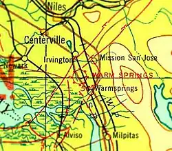 Abel NOLF, Abel Naval Naval Auxiliary Landing Field, was a World War 2 training airstrip. The Navy took over the Warm Springs Airport built in 1933 and built a new runway nearby. The Airport became a satellite for Livermore NAS in 1943. The runway was located 1 mile north of the City of Milpitas, California at 37°27′22″N 121°54′22″W / 37.456°N 121.906°W. The Navy ended the use of the runway in 1945. In 1946 Warm Springs Airport, also called Milpitas Airport and Warm Springs Gliderport, became a public airport for airplanes and gliders. The Airport offered training, charters, repairs and model airplane flying. The airport had a single unpaved north/south 3,800-foot runway. In the Spring of 1952 the airport closed and became a housing tract.[2]