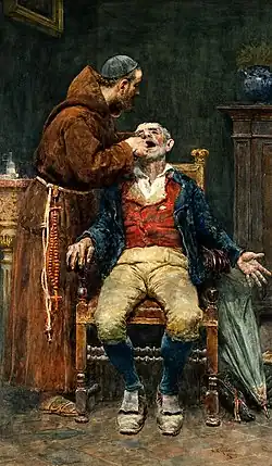 He first gained popularity when he made his formal debut with Venetian and Roman landscapes, and genre scenes; very traditional in style and rendered in great detail. In 1870, he exhibited with the "Società degli Amatori e Cultori di Belle Arti" then, in 1873, he presented his depiction of a chicken market at the Vienna World's Fair. During this time, he was influenced by the works of Marià Fortuny and made his color scheme more complex. He also began painting with tempera and watercolors.
