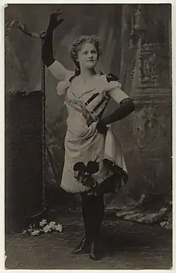 In April 1893 she appeared at the opening night performance of the West London Theatre of Varieties in London, while in 1895 she introduced the song and accompanying dance The Coon's Serenade.[7] In 1900 she was on the bill at the Tivoli Theatre in Birmingham.[8]