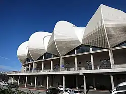 The stadium was designed by the Department of Public Works' National Construction Week Programme in 2006 with student from Holy Cross High School Thina Dlulane, Yandisa Dalamba, Inga Ngalonkulu and Siyabonga Nyezi from Umtata. Their design that was reviewed in the Mahlamba Ndlopfu Presidency House by the Public Work delegates and was the winning designed prototype concept and was the inspiration behind the design.[4] The stadium has a unique roof-structure and views over the North End Lake. The roof is made up of a series of white 'petals' making it look like a flower. This is the reason for the stadium's nickname, The Protea. The stadium building is approximately 40m high and consists of six levels on the western side in addition to five on each of the north, south and east stands.[1] The main architecture was handled by Architectural Design Associates(Pty)Ltd and Dominic Bonnesse Architects cc. The stadium has three gates for entry, located on the northern, southern and eastern sides of the stadium, the western side of the stadium leads to the North End Lake. The 3 gates are: gate A-B, in Milner Avenue, gate B-C, in Prince Alfred Road, and gate C-D, in Fettes Road.[5]
