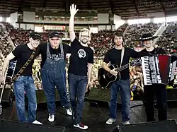 Nenhum de Nós (Portuguese for None of Us) is a Brazilian pop rock band formed in 1986 in Porto Alegre, Rio Grande do Sul. The band primarily consists of former Engenheiros do Hawaii member Carlos Stein (guitar), Sady Hömrich (drums), Thedy Corrêa (lead vocals) and Veco Marques (guitar). One of the most famous Brazilian pop rock bands, they are well known for the song "Camila, Camila". Another member was João Vicenti (keyboards), who died on March 27, 2024.