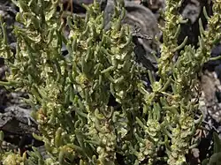 Neokochia americana is a squat dwarf shrub growing many sprawling, mostly unbranched stems to a maximum height near 40 centimeters. The stems are covered in small, fleshy, knobby leaves less than 2 centimeters long. The stems and foliage are sometimes slightly hairy. Leaf anatomy is of the "C3 Neokochia americana type" with a thick-walled aqueous tissue.[1] White-woolly flowers appear singly or in small clusters. The fruiting perianth is 5-winged.