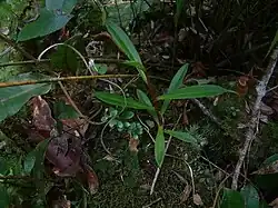 Leaves are sessile and coriaceous.[2] The lamina is lanceolate-spathulate in form. It may be up to 10 cm long and 2 cm wide. It has an acute apex and is gradually attenuate towards the base, which clasps the stem for one third to a half of its circumference.[2] Around three pairs of longitudinal veins are present on the lamina, originating from the basal third of the midrib. Pinnate veins are oblique and irregularly reticulate, although they are not easily distinguishable.[2] Tendrils can be up to 15 cm long and may or may not have a curl.[8]