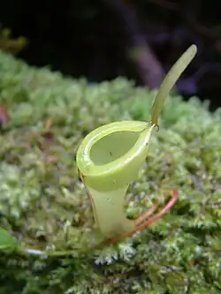 Upper pitchers are generally larger, growing to 8 cm in height and 4 cm in width. They gradually arise from the ends of the tendrils, forming a 5 to 10 mm wide curve.[2] They are tubular to infundibular in the lower parts with laterally appressed pitcher walls. As in N. inermis, there is almost no gap between the walls in mature pitchers. The upper part of the pitcher is widely infundibular throughout. Wings are reduced to ribs in upper pitchers. The inner surface of the pitcher is covered with numerous small, slightly depressed glands, occurring at a density of 600-900 per square centimetre;[2] it lacks a waxy zone.[10] The pitcher mouth is ovate, horizontal, and acute towards the lid.[2] It bears a cylindrical or involute peristome (≤4 mm wide) with indistinct teeth spaced 0.25 to 0.5 mm apart.[2] The inner portion of the peristome accounts for around 45% of its total cross-sectional surface length.[10] The lid is narrowly cuneate, without appendages, and up to 4 cm long and 0.7 cm wide. It is rounded at the apex, gradually attenuate towards the base, and bears numerous small round or elliptical glands on its undersurface.[2] Characteristically, it is almost always reflexed beyond 180 degrees relative to the pitcher mouth.[8] In upper pitchers, the unbranched spur is 3 to 5 mm long.[2]