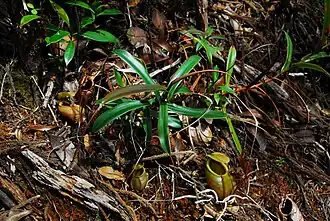 This species grows terrestrially in a wide range of habitats, including upper montane mossy forest, secondary vegetation, ridge tops, cliff sides, and landslides.[3] It has also been recorded at the margins of montane forest around the so-called Bonsai Forest,[1] which is named for its stunted trees. The species is restricted to ultramafic substrates. While N. micramphora tolerates shady conditions, it grows best under direct sunlight.[3] On Mount Hamiguitan, N. micramphora is sympatric with N. alata (sensu lato), N. justinae[5] (previously identified as N. mindanaoensis), and N. peltata,[1] and grows in the same altitudinal range as N. hamiguitanensis.[4] Despite this, no natural hybrids have been observed with certainty.