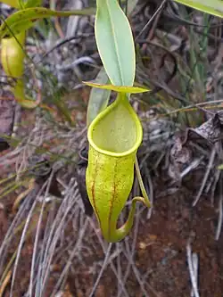 Rosette and lower pitchers are narrowly ovate in the basal portion and cylindrical or sometimes slightly infundibular above.[3] They are very small, reaching only 4.1 cm in height by 1.6 cm in width. A pair of wings (≤4 mm wide) typically runs down the ventral surface of the pitcher cup, although these may be reduced to ribs.[3] The wings bear fringe elements measuring around 3 mm and spaced 2.5–3 mm apart. Only the basal third of the interior surface of the pitcher is glandular. The peristome is cylindrical and up to 0.8 mm wide, bearing ribs up to 0.1 mm high and spaced 0.1 mm apart.[3] Teeth are not visible on the inner margin of the peristome.[2] The pitcher lid or operculum may be elliptic, ovate, or orbicular, and generally has a cordate base.[3] The lid lacks appendages[3] and measures up to 2 cm in length by 1.8 cm in width, being slightly wider than the pitcher mouth.[1] The nectar glands of the lower lid surface number more than 100.[2] A branched or divided[3] spur (≤3 mm long) is inserted near the base of the lid.[1]