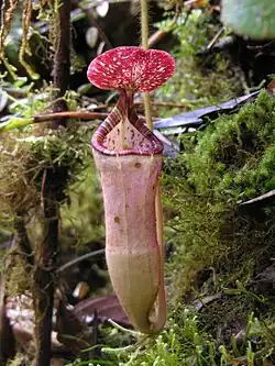 Upper pitchers gradually arise from the ends of the tendrils, forming a 15 to 20 mm wide curve. They are infundibular in shape and reach much greater dimensions than their lower counterparts, measuring up to 18 cm high by 8 cm wide. Like terrestrial pitchers, they lack wings, instead having a pair of prominent ribs. The pitcher mouth is positioned almost horizontally at the front, but rises into a neck (≤3 cm high) towards the rear. The flattened peristome is up to 12 mm wide and bears ribs spaced 1⁄3 mm apart which terminate in short teeth. Virtually the entire inner surface of the pitcher is glandular, having very small overarched glands at a density of 2000 to 2500 per square centimetre. The pitcher lid suborbicular, deeply cordate, and measures up to 7 cm in length. Small round glands are scattered throughout the lower surface of the lid and a prominent hook-like crest is present near the base.[2][3]