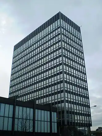 New Century House was designed by G. S. Hay and Gordon Tait and constructed by John Laing & Son for the Co-operative Insurance Society in 1962.[1] The attached New Century Hall has a capacity of 1,000 people. New Century House and Hall were Grade II listed in 1995 as a good example of a high-quality post-war office building.[2] It is considered one of the finest modernist towers in the United Kingdom alongside its sister building the CIS Tower (1962, Grade II), the Arts Tower in Sheffield (Grade II*) and Euston Tower (1970) in London. It is described in its listing as, "A design of discipline and consistency which forms part of a group with the Co-operative Insurance Society".[2]
