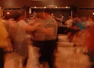 A NEFFA Thursday night contra dance at the Fresh Pond VFW in Cambridge, Massachusetts, in May 2003, (before the dance moved to Concord)