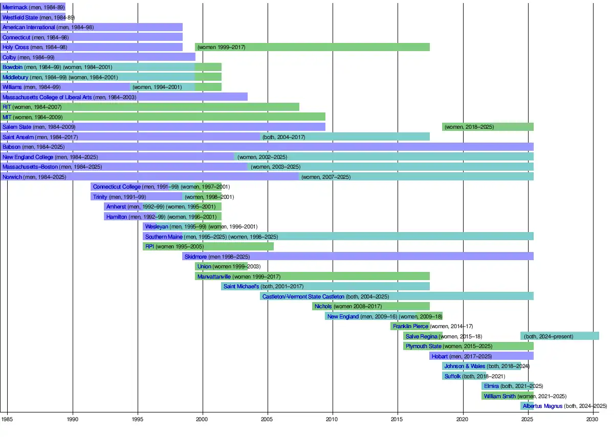 In 2022, Johnson & Wales University announced that they would join Commonwealth Coast Conference as a full-member starting in 2024-25 and sponsor both men's ice hockey and women's ice hockey.[2] In the summer of 2023, Keene State announced that they would begin sponsoring men's and women's ice hockey starting with the 2024–25 season.[3] This gave the Little East Conference six member schools that supported men's ice hockey, the minimum number required for an automatic bid to the NCAA tournament. Shortly afterwards, the Little East announced that they would begin sponsoring men's ice hockey as a sport and begin play in the 2025-26 season.[4] In early 2024, New England College was accepted by the Little East as an affiliate ice hockey member, enabling the conference to also support women's hockey.[5] Less than a month later, two more NEHC teams announced that they would be joining the Little East as affiliate members and both Babson and Norwich would be leaving in 2025.[6] The bleeding continued when, in April and May, Hobart, Skidmore and William Smith announced their move to the SUNYAC,[7] while Albertus Magus (who had yet to play a game in the NEHC) and Elmira both announced that they would be leaving to join the UCHC, all in 2025.[8] Salem State also announced that they will leave in 2025 to join their primary conference (MASCAC) and will also start to sponsor women's ice hockey the same year.[9] With just one school remaining for the start of the 2025–26 season, the future of the NEHC is in doubt.