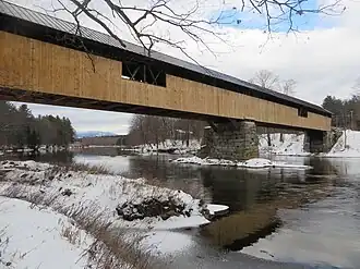 Built in 1829 over the Pemigewasset River. Damaged by a tropical storm in 2011; repaired and reopened in 2015. |