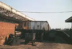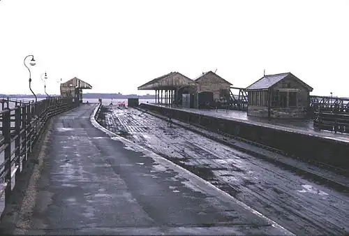 From 1923 the pier and station were closed for reconstruction, reopening on 19 March 1928.[20][21] The station had two platforms with a siding between, the western platform doubling up as a wooden roadway used by vehicles coming to and from ferries. Foot passengers from the ferry and passenger trains most often used the platform on the eastern side of the pier.[22] The central siding often contained one or two coal wagons from which a small road 'train' of tubs was loaded and taken down the access ramps to ferry steamers.[23][24] Originally the station had an overall roof but this was later removed.[6][25] The station buildings were made of wood and included a signal box and refreshment rooms on the more substantial eastern side.[26][27]