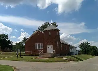 Its building is a one-story east-facing front-gabled red brick building and has a square corner tower. It has a concrete block education wing with a basement which was added at the rear in about 1948.[2]