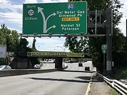 Another freeway routing of Route 20 was planned in 1959.[8] This road, which was to be a six-lane freeway called the Paterson Peripheral, was to run from Clifton north to the existing Route 20 in downtown Paterson. This road was completed between the Garden State Parkway and Valley Road by 1969 and north to Interstate 80 in 1975.[9][10] Upon completion, this road received the Route 20 designation.[9] In 1972, the state once again took over maintenance of the Paterson Plank Road from Route 3 to Route 17 in East Rutherford and made it a part of the route.[11] As it became clear that these three sections of Route 20 would not be connected, especially after the designation of the Great Falls Historic District, they received three different route designations by the 1990s. The freeway section of Route 20 from the Garden State Parkway to Interstate 80 was designated Route 19, the section between Route 3 and Route 17 was designated Route 120, and the Route 20 designation was retained along McLean Boulevard through Paterson.[12][13] The unfinished section of Route 20 that was to connect McLean Boulevard to Paterson Plank Road was built as a northern extension of the Route 21 freeway in 2000.[14][15]