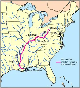 New Orleans was the first steamboat on the western waters of the United States. Her 1811–1812 voyage from Pittsburgh, Pennsylvania, to New Orleans, Louisiana, on the Ohio and Mississippi rivers ushered in the era of commercial steamboat navigation on the western and mid-western continental rivers.
