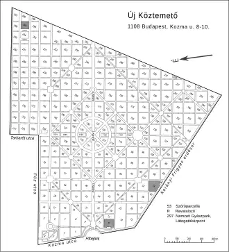 New Public Cemetery (Hungarian: Új köztemető or Rákoskeresztúri sírkert) is the largest cemetery in Budapest and one of the largest in Europe with an area of about 2.07 km2 and 3 million burials since its opening in 1886. It is adjacent to the Kozma Street Cemetery; the largest Jewish cemetery in Hungary. Its main building, which was constructed in 1903, has a 26-meter-high bell tower. In addition to its rich vegetation and wide avenues, the cemetery is famous for plot 301, where the martyrs of the 1956 revolution were buried. Today, an enormous modern monument by György Jovánovics marks their graves.