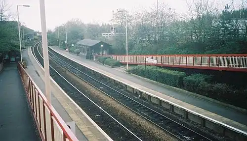 New Pudsey station seen from the road bridge of Owlcotes Lane with footbridge and access ramps to platforms in March 2007