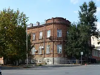 The building was constructed in the end of the 19th century.[4] Before the Revolution of 1917 the facade of the house was decorated in a different way compared to how it looks now, and the interior space was distinguished by a rich interior. On the wall of the house there is a memorial plaque that read that on February 13, 1943, a red banner was set here by the soldiers of the 2nd Guards Army, when Novocherkassk was liberated from German invaders.[1] After the end of World War II, the building housed a secondary school and later a psychoneurological dispensary.[4] In 1992, the house was recognized as an object of cultural heritage and an architectural monument.[5]