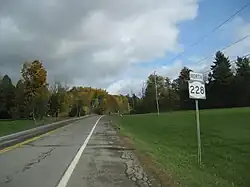 New York State Route 228 (NY 228) is a state highway in Schuyler County, New York, in the United States. It runs for 12.47 miles (20.07 km) in a northeast to southwest direction from an intersection with NY 224 in the village of Odessa to a junction with NY 227 in the hamlet of Perry City within the town of Hector. NY 228 has a short overlap with NY 79 in the Hector community of Mecklenburg. The route was assigned as part of the 1930 renumbering of state highways in New York; however, it initially ended at NY 79 in Mecklenburg, from where NY 79 went north to Perry City. NY 79 was realigned to head west from Mecklenburg in the early 1960s, at which time the NY 228 designation was extended northward over NY 79's former routing.