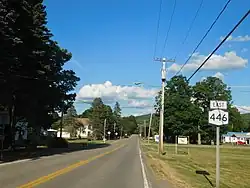 New York State Route 446 (NY 446) is a state highway in the Southern Tier of New York in the United States. The highway extends for 6.76 miles (10.88 km) on a northeast–southwest alignment from an intersection with NY 16 north of the hamlet of Hinsdale to a junction with NY 305 in the village of Cuba. It parallels the Southern Tier Expressway (NY 17 and Interstate 86 or I-86) very closely for its entire length. NY 446 was originally designated as part of Route 4, an unsigned legislative route, in 1908. The Hinsdale–Cuba highway received its first posted designation in 1924 when it was included as part of NY 17. It was renumbered twice, becoming part of NY 63 in 1930 and NY 408 in the 1940s, before gaining its current designation on July 1, 1974.