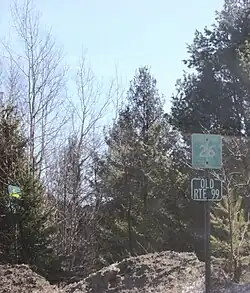 Although NY 99 was signed as a state highway, maintenance on the route was performed by Franklin County, which designated the roadway as CR 26.[13][14] All of NY 99 was initially a gravel road; however, most of the road was paved in the early 1970s through the use of state funds procured by New York State Senator Ronald Stafford of Plattsburgh.[15][16] The western and eastern extents of the road were paved soon afterward; however, the road was left unpaved in the vicinity of Loon Lake—a lake near the midpoint of the route—even though the necessary gravel base was applied to the entire highway. The unpaved section deteriorated as a result,[15][17] and the NY 99 designation was removed from the roadway on September 26, 1994.[3]