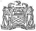 1955 | Escutcheon: Gules on a Bend wavy argent cotised wavy or between two escallops of the second three lymphads each fesswise that in the centre sable the others of the first all with sails furled and pennons flying on a chief also of the second a ram's head caboshed proper between two open books proper bound gules edged gold.