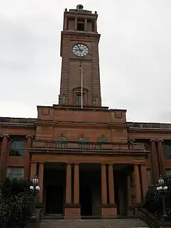 The building, located at 289 King Street, was designed by noted theatre architect Henry Eli White and the foundation stone was laid by the Governor of New South Wales, Sir Dudley de Chair, on 20 April 1928.[2] The three-storey building structure is based on a steel frame that supports concrete floors and stone cladding. Local materials were used as much as possible, including steel provided at a discount by local steelmaker, BHP.[2] Architectural features include a clock tower, porte cochere, balustrades and stairs, all built with Sydney sandstone. The clock tower is an imposing landmark and distinctive feature of the city skyline, indicating the Civic Centre of Newcastle. The tower is a reinforced concrete and steel framed structure clad in Sydney yellowblock sandstone ashlar with rusticated quoins.[2][3] Interior spaces include a ballroom, concert hall and additional function rooms.[2][4]