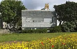 At Newlyn Art Gallery, the pavilion on the seaward side of the gallery is a glass structure on the ground-floor level, which supports a first floor clad in wet-laid Cornish slate, a building method specific to the region, but rarely seen in modern buildings. The glass curtain wall allows panoramic views of Newlyn Green and the sea while sliding doors lead to a secluded garden and outdoor seating area. The versatile Lower Gallery presents small exhibitions, projects and events. The Education Room and Studio Cafe on the first floor of the pavilion has a large window offering panoramic views across Mount's Bay, as well as a skylight the length of the gabled ceiling.
