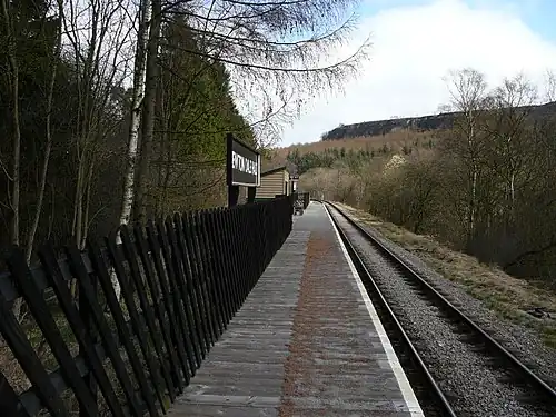 The halt was built by the North Yorkshire Moors Railway using materials from Warrenby Halt, near Redcar.[4] The halt was a new construction that was a joint enterprise between the NYMR, the Forestry Commission and the North York Moors National Park Authority.[3] The station was opened on 23 April 1981 by Hector Monro (Minister for Sport), near to the former Newtondale signal box that had last been used in 1930 and was demolished by the NYMR in 1995 due to it being unsafe.[5][6][7][8]