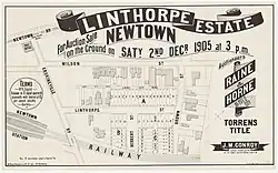 Newtown was established as a residential and farming area in the early 19th century.[8] Nicholas Devine, the first principal superintendent of convicts called his property Burren Farm, after a region of County Clare in his native Ireland. Burren Farm would later become parts of Newtown and Macdonaldtown (now Erskineville).[9]