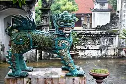 Nghê (chữ Hán: 猊) is a mythical animal in Vietnamese culture, a combination of kỳ lân (or lion) and dog, often used as a mascot in front of communal temples, temples, pagodas, shrines in Vietnam. In the countryside of North Vietnam, in front of the village gate there is always a big stone Nghê to protect the whole village, in front of the communal temple gate there is a stone Nghê, and in front of each house there is usually a small stone dog sitting in front of the guard. To keep it for the homeowner, in the southern countryside in front of the house, the guide often places a statue of a dog ceramic.