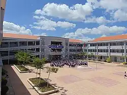 NQD began its expansion project with a groundbreaking ceremony on July 8, 2011. The campus is now 1575 square meters and has three distinct areas devoted to offices, classrooms, and laboratories. In the three-story tall main building, there are a total of twenty-seven traditional classrooms, each equipped with high-tech smart televisions, as well as eight laboratories for various science classes. In the center of the school is a large, open courtyard.[4] While this area is primarily used for Physical education, Defense Education, and Monday morning flag-saluting ceremonies, students also socialize there during breaks and after school.