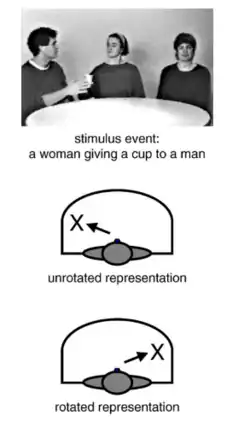 Illustration of unrotated and rotated representation of a giving event. The location is compared with the man's location in the event to determine the rotation of the representation.