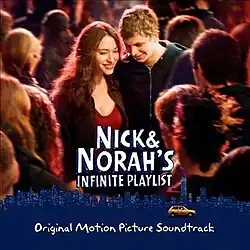 Cohn and Levithan's novel had several musical references, including songs by the Cure and Green Day, as did Scafaria's screenplay.[2] She originally submitted with a CD mix featuring her ideas for the film's soundtrack, that included songs by The Black Keys, Bloc Party, and Frou Frou.[2] However, in the final cut of the film, most of the music was chosen by Sollett, along with Kerstein and Cohen.[1] Sollett said that he "got lucky" with the songs that he was able to choose because, within the financiers and the studio, "there was nobody in that group who knew all that much about music or the music that we had in the film".[1] His objective when selecting the music was to find "the best music you haven't heard yet", primarily from bands based in New York City, which was "additive to the film and each individual scene".[3] While filming in New York, he emailed songs "right out of my iTunes [library]" which he thought would suit particular scenes to Kerstein, who was in Los Angeles assembling the film as it was shot.[4]