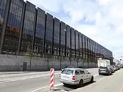 In 1961, an architectural competition was announced for a new building for Nationalbank, which was won by Arne Jacobsen. As the bank had to be in operation throughout the construction period, the construction had to be done in stages. It started in the north in 1964, where, among other things, the Hotel Kongen af Danmark was demolished. The rest of the southern side of Niels Juels Gade was also gradually cleared, including the Schultz Forlag sbuilding in no. 10–12, which they had built in 1872. The combined Nationalbank was completed in 1978. Along Niels Juels Gade is the five-storey main building with a plinth wall in Norwegian marble on the ground floor and dark-tinted glass on the other floors, like the houses on the other side of the street is reflected in. Inside the main building, there are two light gardens with roof gardens on top of the ground floor, so that daylight can enter the building. On the other hand, there are no doors on this side of the building, as the main entrance is on Havnegade. On the other hand, there are a number of trees along the bank on Niels Juels Gade.[6][7]