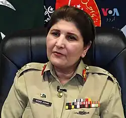 Nigar Johar Khan HI(M) TI(M) (Urdu: نگار جوہر) is a retired three-star general in the Pakistan Army.[2] Nigar is the first and only woman in the history of Pakistan Army to reach the rank of lieutenant-general,[3][4] and the third to reach the rank of major-general.[5] She belongs to the Pakistan Army Medical Corps and served as the surgeon general of Pakistan Army and Colonel commandant of Army Medical Corps.[6] The other five women major-generals Shahida Badsha, Shahida Malik, Shehla Baqai, Abeera Chaudhry and Shazia Nisar also belong to the Army Medical Corps.[7]