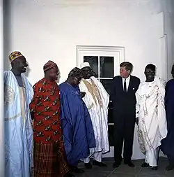 Formal diplomatic relations were established with the opening of the American Embassy in Lagos and of the Nigerian Embassy in Washington, both on 1 October 1960, the same day which Nigeria acquired its independence from British rule.[7] American president Dwight D. Eisenhower was represented at the independence ceremonies by Nelson Rockefeller, the Governor of New York.[8] In his message to the new government on 2 October,[7] Eisenhower promised Nigeria the support of the United States (U.S.), but also warned about possible threats from outside its borders – understood as a veiled reference to the Soviet Union, and therefore a harbinger of the Cold War dynamics that were to shape Nigeria–U.S. relations in this early period.[9] Upon Nigeria's admission to the United Nations (UN) later in 1960, Prime Minister Abubakar Tafawa Balewa announced that, as a matter of policy, Nigeria would remain neutral of the Cold War power blocs, and would not sacrifice its independence to East–West rivalries.[8] However, although the civilian administration of the Nigerian First Republic was formally non-aligned, it was also "openly, though not slavishly, pro-West".[10] This was partly a matter of diplomatic and economic orientation, as a result of Nigeria's continued closeness with Britain, but it also involved ideological affinities.[11] As Balewa reflected in a 1961 speech to Nigerian parliamentarians, "We admire the American way of life, and we respect the people of the United States for their love of freedom".[12]