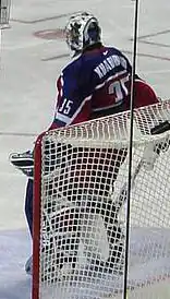 In July 2008, the Blackhawks signed goaltender Cristobal Huet, previously of the Washington Capitals. The signing of Huet was thought to have effectively displaced Khabibulin as the starting goaltender, especially given he was put on waivers on September 29, 2008, but cleared.[7] In light of Huet and Khabibulin's combined salaries (Huet was signed to a contract averaging $5.6 million per season),[8] it was speculated Khabibulin would be traded to provide cap space.[7][9] However, he spent the entire season with the team, playing in 42 games, and by the start of the 2009 playoffs, he had retrenched himself as starting goaltender. Khabibulin and the Blackhawks defeated the Calgary Flames and Vancouver Canucks to progress to the Western Conference Finals against the Detroit Red Wings. During the third game of the series, Khabibulin surrendered three goals in one period after shutting out the Red Wings in the previous period. He was replaced by Huet for the third period due to a lower body injury.[10] Khabibulin missed the remaining three games of the series as a result of the injury.[11]