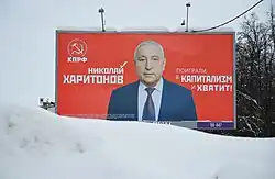 Kharitonov was strongly supported by party leader Gennady Zyuganov. Many of Kharitonov's advertisements featured Zyuganov speaking on behalf of his candidacy.[6] Although Zyuganov had originally wanted the party to abstain from participating in the elections to protest what he considered to be the "undemocratic nature" of the election, he could not coalesce the party in agreement on non-participation and ultimately supported Kharitonov.[6][5]