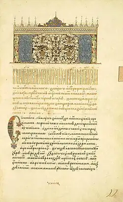 Nikon produced two major compilations of ecclesiastical texts: the Pandektai (Pandects), a collection of conciliar and patristic writings on canon law for wandering monks, and the Taktikon, a collection of forty chapters of authoritative texts on liturgical problems.[2] The Pandektai was written while he was still on the Black Mountain.[1] It contains one episode cited to the Euthymiac History, which is one of only two surviving excerpts from this otherwise lost work.[4] The Taktikon includes a typikon initially intended for the community he founded, but they rejected it and the community disbanded.[1] The typikon was taken up by the monastery of the Virgin of the Pomegranate.[2] From the 13th century, the Taktikon was the main authority in Russian monasticism.[1]