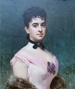 Fagnani was the daughter of Italian-born painter Giuseppe Fagnani, who had emigrated to the United States in the company of Sir Henry Bulwer when he came to take up his post as British ambassador in 1849. He later became an American citizen and married, in 1851, Harriet Emma Everett Goodwin of Charlestown, Massachusetts. The couple took up residence in New York City, where Nina was born on September 24, 1856.[1] Her artistic studies took place in Paris, where she worked with the widow of William Wyld, as well as with one Mme. Grec. She first exhibited at the Paris Salon of 1880, showing a Portrait of an Infant on enamel; she exhibited also at the Salons of 1890, 1895, 1896, and 1898, and in 1892 presented a work at the Royal Academy of Arts in London.[2]
